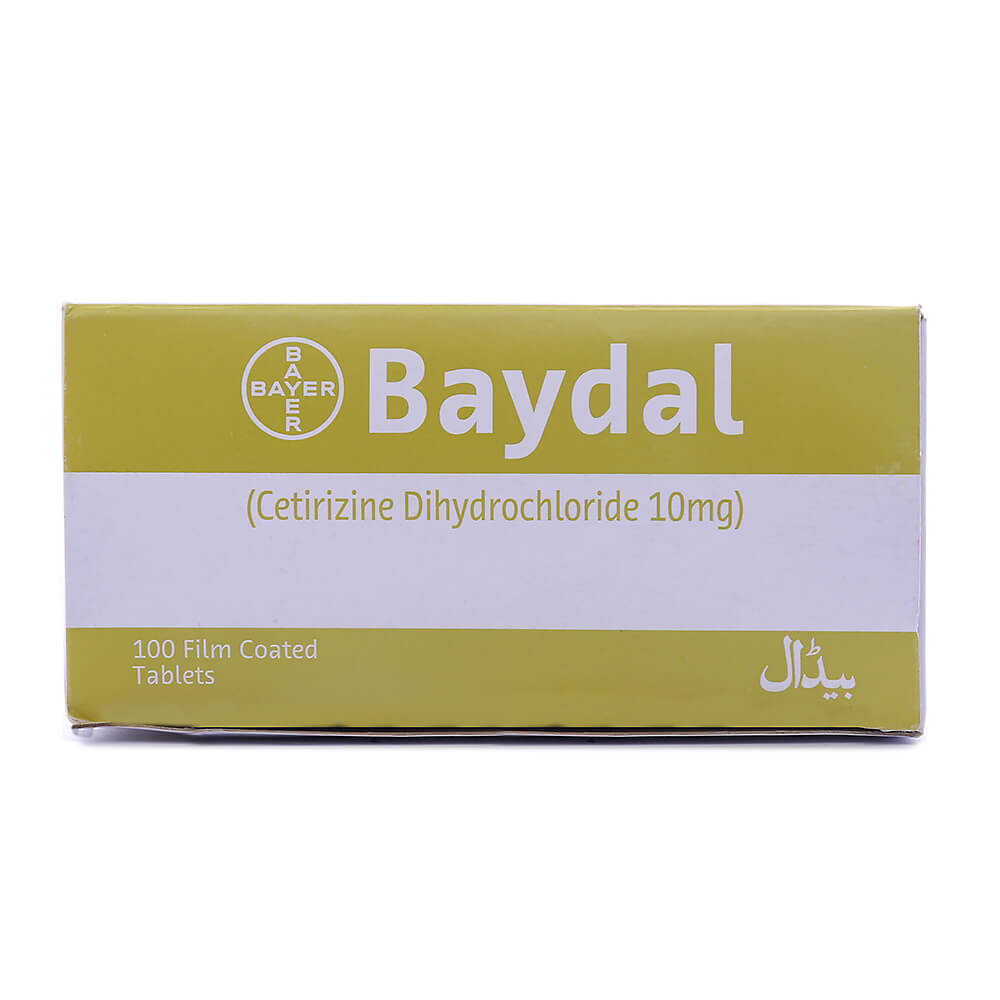 Baydal tablet is classified as an Allergic medication. It can relieve various allergy symptoms; such as watery eyes, runny nose, itchy eyes, itchy nose, sneezing,urticaria,allergic rhinitis and general itching. It is composed of Cetirizine dihydrochloride.