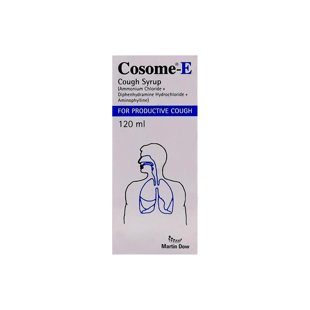 Cosome-E Cough Syrup is helpful for the treatment of wheezing, shortness of breath, and difficulty breathing caused by asthma, chronic bronchitis, emphysema, and other lung diseases. It contains aminophylline, Diphenhydramine Hcl, Ammonium Chloride, Menthol as active ingredients.