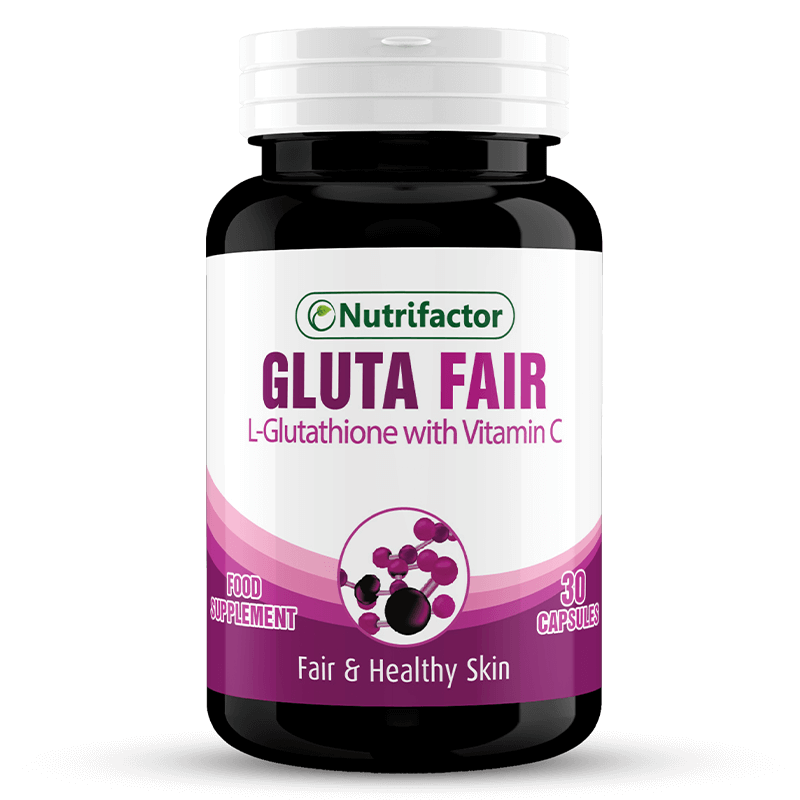 - Nutrifactor’s Gluta Fair is a food supplement which contains L-glutathione and Vitamin C (ascorbic acid), both of these are strong antioxidants that help to reduce oxidative stress in body.