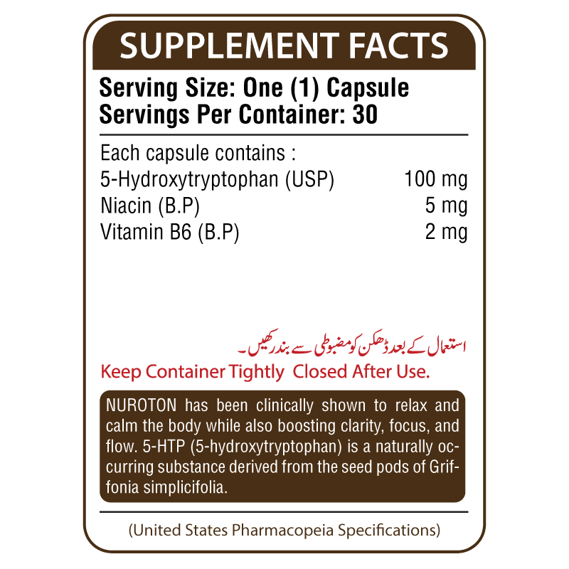 - Nutrifactor’s Nuroton is a food supplement containing 5-HTP, a naturally occurring substance derived from the seed pods of Griffonia simplicifolia, a West African medicinal plant that helps in depression, anxiety, stress, insomnia and restlessness naturally. It also helps to improve mood and calm the body.